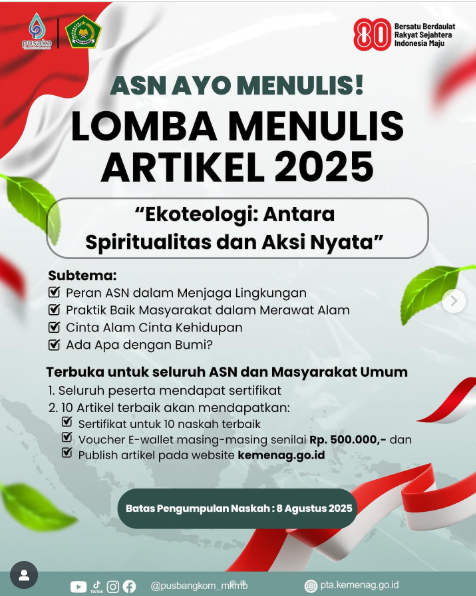 Pada 17 Agustus 2025, Saskia Astriana Muhammad, mahasiswa Program Studi Manajemen Dakwah Fakultas Ushuluddin, Adab, dan Dakwah (FUAD) IAIN Manado, turut ambil bagian dalam Lomba Menulis Artikel 2025 yang digelar Pusbangkom Manajemen Kepemimpinan dan Moderasi Beragama Kementerian Agama RI. Lomba ini merupakan bagian dari peringatan 80 Tahun Kemerdekaan Republik Indonesia dengan mengusung tema “Ekoteologi: Antara Spiritualitas dan Aksi Nyata”.